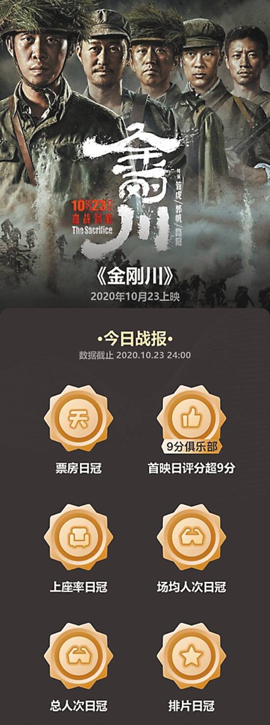 羊城晚报记者 李丽 今年,中国电影人将呈现一系列抗美援朝题材的电影作品,以纪念中国人民志愿军抗美援朝出国作战70周年。10月23日,由管虎、郭帆、路阳共同执导的电影《金刚川》率先公映,并获得票房口碑双重肯定。身为中国“第一票仓”的广东,首映当天在省会广州的标志性建筑广州塔上打出了电影《金刚川》的宣传标语,为这部国庆档后最受关注的影片助力。 国庆档后最火大片,热血又催泪 《金刚川》以战争亲历者的角度讲述了一段发生在抗美援朝主战场之外的战争往事:为助我方主力部队及时赶赴金城大决战的战场,一群包括工兵和炮兵等不同兵种在内的英雄志愿军必须完成一项不可能的任务——在美方空军不断的狂轰滥炸中,于天亮前在金刚川上架起一座木桥。影片从多个视角还原了金刚川上这悲壮一晚,张译、吴京、李九霄、魏晨、邓超等演员更是奉献出从业生涯里最热血亦最催泪的表演。 羊城晚报全媒体记者10月24日上午于天河区佰合兆影城所见,当天前来观影的观众大多冲《金刚川》而来,且年轻人占了多数。观影过程中,观众的泪水在黑暗中闪烁,吴京饰演的炮兵老关牺牲后影厅四处传来啜泣声。影片的情感高潮发生在接近尾声时,张译扮演的炮兵张飞被美军轰炸机几乎炸碎半边身体后,点亮炮台四周以吸引火力,掩护大部队顺利过江,同时以信念支撑着打完了最后一组炮弹,与美军轰炸机同归于尽。那一刻,影厅内鸦雀无声,观众被震撼到忘记了哭泣。 截至10月24日16时,《金刚川》票房已达1.74亿元,当天排片占比高达53.3%。同时,在《金刚川》的热度带领下,周五和周六连续两天票房均突破亿元大关,其中10月23日周五的总票房为1.41亿元。在淘票票购票平台,观众为《金刚川》打出了平均9.5分的高分,甚至超过国庆档口碑电影《我和我的家乡》,成为同期上映影片中的口碑NO.1。在评论区,观众纷纷表达自己观影后的震撼与感动。“看哭了!”“看到志愿军的牺牲忍不住红了双眼。”“有幸生活在这个和平年代。” “第一票仓”再度发力,领跑《金刚川》 根据国家电影局数据,2019年中国电影总票房642.66亿元,同比增长5.4%。其中广东省票房收入为89.51亿元,占当年全国票房总收入的13.93%,再次荣登全国榜首。至此,广东省的“全国第一票仓”地位已连续保持了18年。此外,广东全省影院总数已达1398家,银幕总数达8424块,均居全国第一。 刚刚过去的国庆档则再次证明了广东观众对电影市场复苏的重要作用。在遵循上座率不超过75%的防疫规范前提下,2020年国庆档期全国累计票房达39.54亿元,放映场次278.19万场,观影人次近1亿。其中,广东地区共贡献票房4.63亿元,全国占比11.7%,放映场次35.59万场,观影人次达1123.66万人。 如今《金刚川》引领国庆档后的电影市场,口碑票房均创新高,广东观众同样贡献斐然。根据猫眼专业版数据,广东已连续两日成为该片的第一票房省份。 据悉,广东省电影局日前曾专程组织召开《金刚川》等抗美援朝题材电影宣发会,推介即将上映的抗美援朝题材影片。同时,广东省电影局还协调广州塔于10月23日影片上映当天的两个黄金时段播出户外广告,并打出字幕:“纪念中国人民志愿军出国作战70周年,电影《金刚川》热映。”该局相关负责人表示,此举是希望吸引更多观众走进影院观看影片,让伟大的抗美援朝精神永续传承。