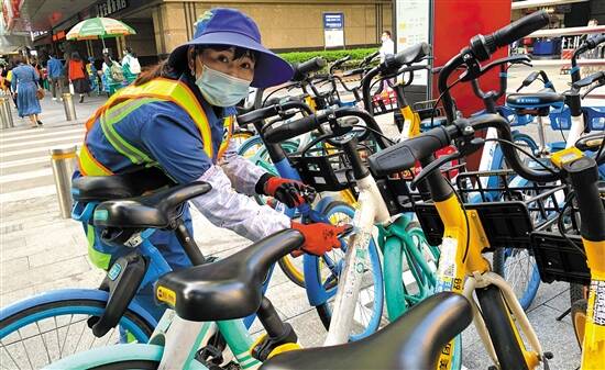 陈玉霞整理乱摆放的共享单车并清理共享单车小广告 羊城晚报记者 梁怿韬 摄 |