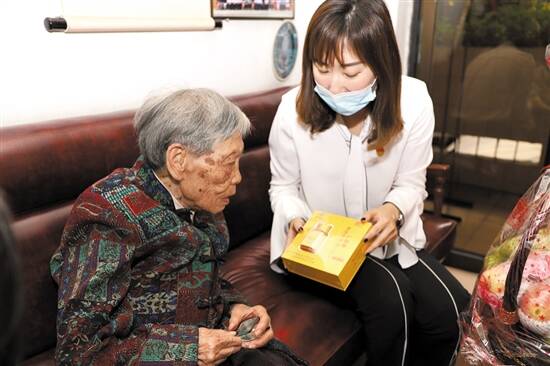 白云山汉方企业代表为104岁的黄爱廉老人赠送慰问品 彭泽祥 摄 |