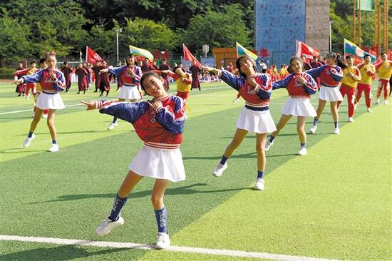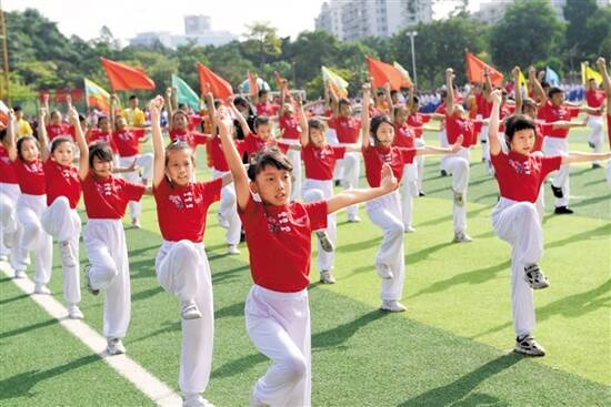 文/羊城晚报记者 蒋隽 通讯员 万菁 图/羊城晚报记者 林桂炎 火炬传递,点燃体育运动之火。11月8日,广大附中教育集团小学教育发展中心2020年体育文化节在广大附中举行。集团内广大附小、花都广附、广附华联、广大附校庆丰校区、增城新星学校、广附英豪校区、江门校区、金沙洲校区、星汇云城校区9所小学校区集结赛场,追求更快、更高、更强。 广附体育文化节开幕 庄严的升旗仪式结束后,广大附中各小学校区方队在校旗的引导下阔步入场。 动作整齐划一、口号铿锵有力,充分体现了本次体育文化节“广附少年强体魄,快乐体育展英姿”的主题。代表更高、更快、更强体育运动精神的火炬在火炬手们的传递下不断汇集,点燃主火炬。 广大附小的国防展示方阵,一招一式求完美,一拳一脚展英姿。他们带着坚定的信念,在成长道路上奋勇向前,永不停歇。随后是精彩纷呈的广大附中各校区团体操展示。 其中,增城新星学校源远流长的经典古诗词——弟子规与武术融合在一起,创意无限。 广州大学附属小学五年级的学生代表带来了国防军事教育成果——匕首操、捕俘拳的展示。 团体操展示活动拉开了广大附中教育集团小学教育发展中心运动会的帷幕,各校区将在广附集团的引领下继续办好运动会。 集团内小学:同教研、同检测 近年来,广州大力推动教育集团发展,优质教育资源均衡普惠。广大附中教育集团校长欧卫国介绍,集团内13个分校有小学部近万名师生,此次文化节9个小学校区齐聚共享体育盛会。 广大附中教育集团小学教育发展中心主任、广州大学附属小学校长林朝霞介绍,全集团所有小学同教研、同考试、同教改、同检测,把控教学质量,“例如小学一年级认读2500字,为学生海量阅读扫清障碍,在集团学校推行后取得良好效果。” 今后集团内小学将共同参与更多体育和艺术活动,促进师生归属感和认同感,推动集团学校共同进步。