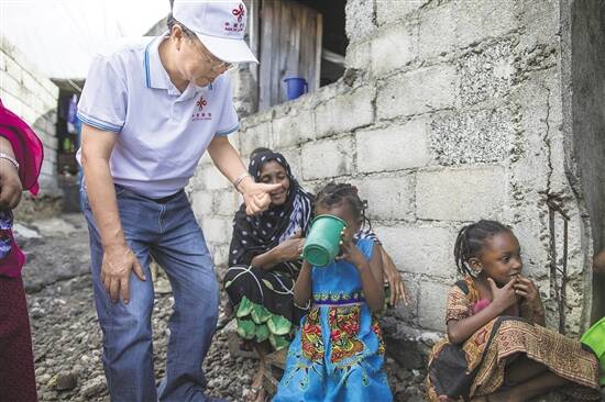 2019年9月11日,非洲科摩罗,广东青蒿素抗疟团队、广州中医药大学热带医学研究所所长宋健平对一名服药的小女童竖起拇指 视觉中国供图 |