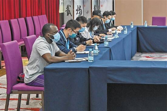 2020年4月18日,广州市黄埔区广州科学城总部国际酒店,志愿者吕威廉(左一)参与防疫工作会议。26岁的吕威廉来自非洲安哥拉,是华南理工大学国际教育学院大四的学生 视觉中国供图 |