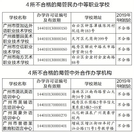 羊城晚报讯 记者蒋隽、实习生高焓报道:广州市教育局近日发布2019年度局管民办学校年检结论。其中,18所局管民办普通高中(含完全中学)全部合格,4所局管民办中等职业学校不合格,4所局管中外合作办学机构全部不合格。 在各区中小学年检中,海珠区24所学校和越秀区6所学校,全部合格。白云区95所学校中,2所基本合格,其余全部合格,合格率为97.9%。花都区45所学校中1所不合格,其余全部合格,合格率为97.8%。番禺区36所学校中1所基本合格,其余全部合格,合格率为97.2%。黄埔区20所学校中,1所不合格,其余全部合格,合格率为95.0%。从化区4所学校中1所基本合格,其余全部合格,合格率为75.0%。天河区45所学校中,5所不合格,7所基本合格,合格率为73.3%。 本次年检的结论有何意义?根据《广州市民办学校年度检查实施办法(试行)》,民办学校年检结论分为 “年检合格”、“年检基本合格”和“年检不合格”三种。对照《广州市教育局民办学校(分类)年检指标体系量化表》,70分以上为“年检合格”,60分至70分为“年检基本合格”,59分以下为“年检不合格”。年检结论将作为学校评优评先、资助奖励、招生计划安排和行政处罚等规范管理的重要依据。