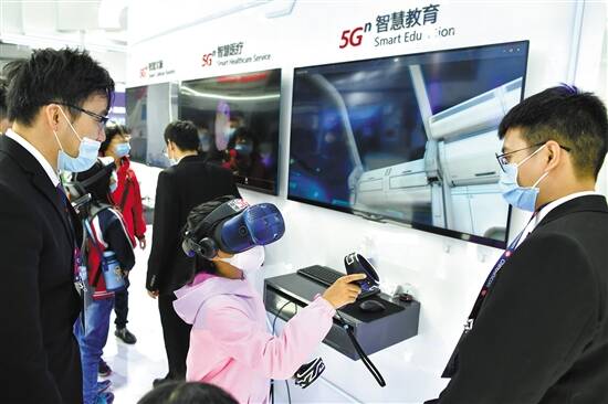 22日,小朋友在中国联通展台体验智慧教育的应用 新华社发 |