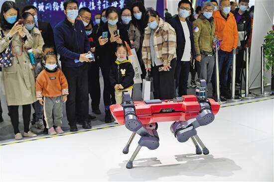 22日,观众在中国电科展台观看四足机器人展示 新华社发 |