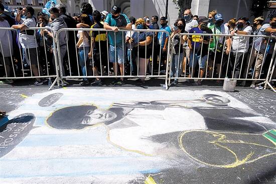 今天在布宜诺斯艾利斯,阿根廷传奇球星迭戈·马拉多纳的遗体告别仪式在总统府玫瑰宫举行,图为艺术家在玫瑰宫前为马拉多纳画像 新华社发 |