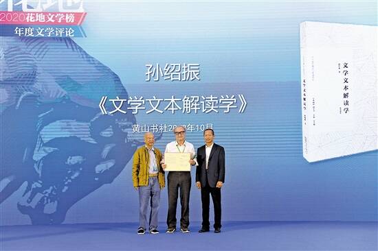 广东省文艺评论家协会名誉主席黄树森(左)、羊城晚报社总编辑林海利(右)为孙绍振颁奖 |