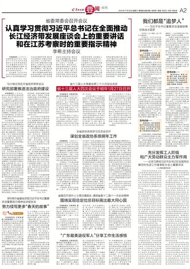 羊城晚报讯 11月27日,省委常委会召开会议,传达学习习近平总书记在全面推动长江经济带发展座谈会上的重要讲话和在江苏考察时的重要指示精神,研究我省贯彻落实意见。省委书记李希主持会议。 会议强调