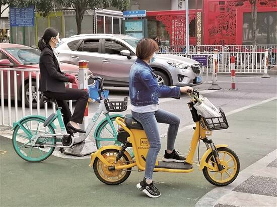 佛山市禅城区骑乘共享电动车的市民 羊城晚报记者 孙梓青 摄 |