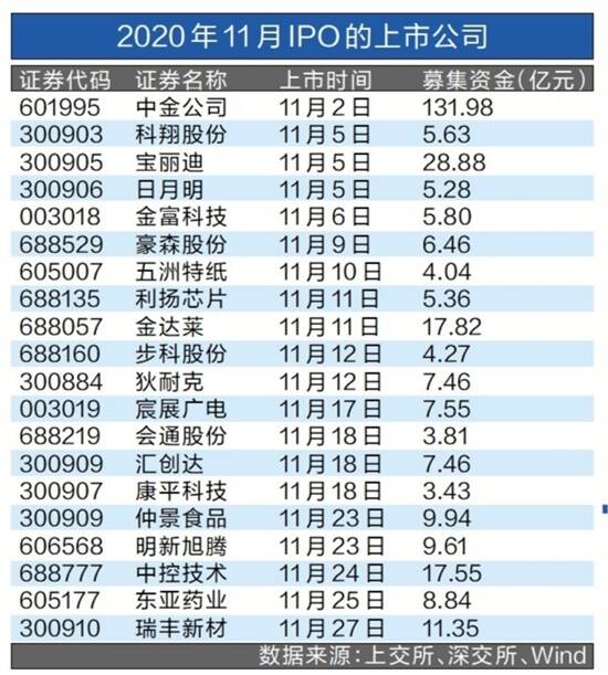 文/图 羊城晚报记者 丁玲 随着科创板成立、新三板精选层改革以及创业板注册制试点等资本市场改革举措落地,2020年,A股迎来IPO大年。羊城晚报记者梳理发现,截至11月30日,今年以来已有342家公司实现了A股IPO,募资总额超4200亿元,创下近十年来新高。其中,刚刚过去的11月就有包括中金公司、会通股份、瑞丰新材在内的21家公司IPO(按上市日统计,下同),首发募集资金达287亿元。 IPO过会率94.78% 在以信息披露为核心的注册制下,科创板和创业板公司发行上市效率显著提高。开源证券数据显示,2019年7月22日至2020年11月20日,科创板公司从受理到上市平均用时228天,创业板(注册制)公司仅用时78天,均明显低于同期主板、中小板、创业板(核准制)的579天、550天、568天。 与此同时,今年IPO项目审核节奏明显加快。1-11月,证监会共审核594个IPO项目,其中563个顺利通过,整体IPO过会率为94.78%。而去年同期,仅有252个首发项目上会审核,整体过会率为88.49%。 发行效率的提升也推动IPO融资扩容。截至2020年11月20日,科创板开市以来,平均每月上市公司数为11家,创业板(注册制)平均每月上市公司数为10家,而主板、中小板、创业板(核准制)则分别为5家、3家和5家;科创板推出以来,平均每月IPO募资额达166.2亿元,创业板(注册制)为127.6亿元,显著高于主板、中小板、创业板(核准制)的104.4亿元、29.2亿元、25.5亿元。 上市公司融资规模分化 值得注意的是,虽然今年A股IPO融资规模在不断扩大,但整体来看,新上市的公司之间融资规模分化较大。以今年11月IPO的上市公司为例,共有17家公司融资规模小于10亿元,3家公司介于10亿元至20亿元之间,1家公司融资规模超过100亿元。 另外,从市场表现看,存量市场创业板的注册制改革实现平稳过渡,甚至进一步激发了市场活力。截至2020年11月20日,创业板实施注册制以来,新股首日平均涨幅高达301%,远高于同期科创板的119%,以及主板和中小板的开板涨幅120%和110%。 打新基金收益可观 值得关注的是,新股发行火热的同时,打新基金的收益也十分可观。打新基金底仓以大蓝筹为主,且持仓风格保持稳定。科创板和创业板高额且接近无风险的打新收益使得网下打新成为基金产品收益增强的主要策略之一,甚至不乏以获取稳定打新收益为目标而设立的打新基金。 根据开源证券数据,在打新红利和底仓的共同作用下,打新基金收益率续创2016年以来新高,年初至今平均收益率已达40.1%(次高为2019年,打新基金平均收益率为25.9%)。 具体来看,今年以来打新基金来自打新的平均收益率为11.3%,其中71只基金打新收益率介于8%-11%,54只基金打新收益率介于11%-14%,是打新收益率分布最为集中的区间。 由于打新基金平均产品规模从2020年9月的2.01亿元扩大到11月的3.13亿元,导致打新收益率被摊薄,但其对打新基金收益率的贡献仍然重要,尤其对于1亿-1.2亿元规模的产品而言,打新收益贡献度超过50%,达57.2%。 券商承销保荐收入翻倍 随着IPO加速发行,各大券商投行的股权承销规模也水涨船高。今年1—11月,仅中信建投、海通证券、中金公司、中信证券4家券商承销的IPO募资规模合计就超过2000亿元。国泰君安位居第五,承销规模也达到215亿元。此外,华泰证券、国金证券和招商证券今年前11月承销的IPO募资规模均在100亿元以上。 IPO承销也为券商带来丰厚回报。今年1—11月,共有58家券商在IPO承销保荐业务上获得收入,较上年同期增加8家;承销保荐总收入合计201.75亿元,较上年同期增长一倍有余。