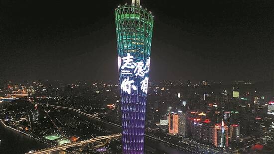 广州塔亮起“志愿者,节日好!”光幕 通讯员供图 |