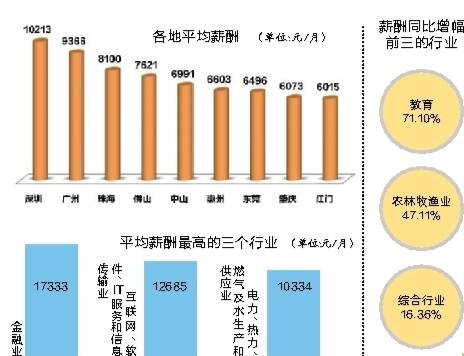 羊城晚报讯 记者周聪、通讯员中南人宣报道:17日,中国南方人才市场发布的《2020-2021年广东地区薪酬趋势》显示,2020年所调查的453个职位的平均月薪均有不同程度的增长,平均增幅为2.02%。从地区来看,深圳平均月薪破万,连续8年居于榜首,达到10213元/月。广州平均薪酬水平在所调查地市中增幅最大,同比增长4.38%。行业方面,金融业平均月薪持续领跑,平均月薪达17333元。 据悉,此次调查总样本量达到252万,数据覆盖广州、深圳、珠海、佛山、惠州、东莞、中山、江门、肇庆等广东9个城市,19个行业,453个职位。 从平均月薪来看,深圳超过1万元,广州以9366元位居第二,珠海、佛山超过7500元,中山、惠州、东莞、肇庆、江门均超过6000元。平均薪酬与学历和工作年限均呈正相关关系,即学历越高、工作年限越长,平均薪酬水平越高。 从行业水平来看,金融等三个行业平均薪酬较高,全部超万元;教育等三个行业薪酬水平增幅较大,最高超70%。金融业和房地产业依然是高收入群体的聚集地,其上市企业高管平均年薪遥遥领先于其他行业。金融业上市企业高管平均薪酬为191.46万元/年,同比增长10.36%;房地产业为161.64万元/年,同比增长6.45%。