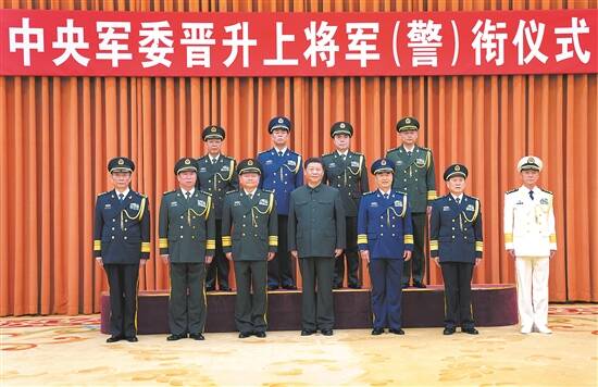 这次晋升上将军衔警衔的军官警官是:军委后勤保障部政治委员郭普校、西部战区司令员张旭东、战略支援部队政治委员李伟、武警部队司令员王春宁。图为习近平等领导同志同晋升上将军衔警衔的军官警官合影。 新华社发