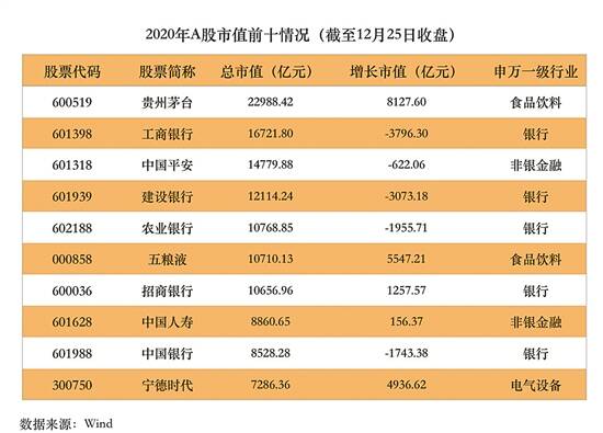 文/表 羊城晚报记者 丁玲 A股千亿市值上市公司阵营再扩容!数据显示,截至12月25日收盘,A股总市值已达82.32万亿元,较年初增加逾18万亿元。其中,沪深两市总市值超过千亿元的股票共有128只,较2019年年末的91只增幅明显。热门板块白酒的龙头股市值增长幅度较大。 五家白酒股市值超千亿元 羊城晚报记者梳理发现,在这128只千亿元市值股票中,超万亿元的有7只,超过5000亿元的有15只,超过3000亿元的有36只,超过2000亿元的有60只。在年内上市的新股中,金龙鱼、京沪高铁、中金公司、中芯国际、公牛集团、中泰证券市值超过千亿元。其中,金龙鱼市值达4814.37亿元,京沪高铁、中金公司超过2000亿元。 以申万一级行业进行划分,共有17家千亿元市值上市公司来自非银金融行业,在涉及的25个申万一级行业中位列第一。来自银行、电子、医药生物、食品饮料、汽车、电子设备行业的分别有16家、13家、10家、10家、7家、7家。 今年以来,医药生物、食品饮料、汽车、电气设备行业成为千亿元市值上市公司集聚地。事实上,今年以来,上述行业市场表现相当突出,年内分别累计上涨50.60%、73.17%、43.35%、93.48%。 以白酒板块为例,截至12月25日收盘,贵州茅台总市值从2019年末的第四名上升到A股市值榜首,达22988.42亿元,较年初上涨56.50%,超过排名第二的工商银行6266.62亿元;另一白酒龙头五粮液市值也突破万亿元,较年初增长5547.21亿元,成为深市首家市值突破万亿元的公司,并冲进A股市值前十名。此外,山西汾酒、洋河股份、古井贡酒市值也超千亿元。 电气设备方面,“明星股”宁德时代上升势头相当强劲,今年1月,宁德时代市值首次站上3000亿元大关,到如今市值翻倍还不止,市值排名从2019年年末的第34名上升到第十名,也成为创业板首个市值超过7000亿元的公司。 比亚迪、海天味业、中国中免年内市值增长也超3000亿元。而随着不少原本市值就较高的公司股价大涨,进入A股市值前十的门槛也大幅提高,从2019年末的5954.87亿元上升至7286.36亿元。 石化双雄跌出A股市值前十 值得关注的是,在五粮液、宁德时代股价飙涨,跻身今年A股市值前十的情况下,“石化双雄”中国石油、中国石化则跌出今年A股市值前十。年内中国石油、中国石化市值分别减少3003.54亿元、1401.24亿元。而如果拉长时间来看,中国石油自2007年上市以来,跌幅已超过90%。 在2020年A股市值前十个股中,贵州茅台、五粮液、招商银行、中国人寿、宁德时代市值实现正增长;工商银行、中国平安、建设银行、农业银行、中国银行市值则有所减少。 在贵州茅台、五粮液等个股市值狂飙之时,工商银行、建设银行、中国石油年内市值减少超3000亿元,农业银行、中国银行、中国石化、交通银行年内市值减少超1000亿元。事实上,在今年市值减少额排名前十的个股中,就有7只银行股。 与此同时,还有多只个股市值跌出“千亿市值俱乐部”,中国交建、中国铁建、中国国航、大秦铁路、中国重工、华夏银行、中油资本年内市值减少超200亿元,与2019年年末超千亿市值相比,市值已不足1000亿元。