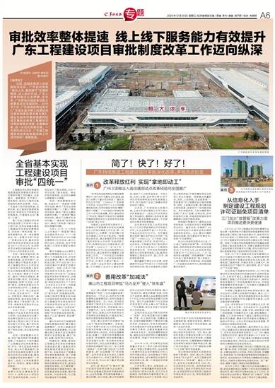 案例1 改革释放红利 实现“拿地即动工” 广州3项做法入选住建部试点改革经验向全国推广 “在项目尚未取得规划方案批复等情况下,我们先行为摩天工坊、联油、联东U谷等5个重大项目核发了‘基坑支护及土方开挖’‘±0.000以下’阶段施工许可证,为企业节约了3-6个月的筹建报批时间,为项目落地与市场‘赛跑’提供了保障。” 广州开发区行政审批局工作人员向记者透露,项目“拿地即动工”的实现,得益于开发区为打造营商环境新优势率先对工业投资项目实施“三阶段”施工许可。 为推进工业投资项目落地开工,报建单位可根据需求和报批进展情况分三阶段办理施工许可证,第一时间进场开工,不需要一次性为整个项目办理施工许可证才能进场。“取得规划条件后,通过承诺即可先行办理‘基坑支护和土方开挖’阶段的施工许可;取得规划设计方案批复后,即可办理‘±0.000以下’(含‘地下室’)阶段的施工许可;在正式取得规划工程许可后,通过承诺可办理整体工程的施工许可。” 广州开发区行政审批局工作人员介绍,分三阶段发放施工许可证,打通开工建设“最后一公里”,实现了企业尽早开工建设的愿望,大大缩短了企业开工建设的时间,降低了人力和资金成本。今年以来,亿航、迈景、百济神州等50多个项目采用承诺制信任审批取得施工许可,有力促进了企业工程建设项目加快动工建设。 近年来,广州持续加大改革力度,上述分阶段办理施工许可只是众多改革措施之一,除此之外还有规划施工两证联办、清单制+告知承诺、豁免审批、融合监管联合验收、不见面全网办等系列改革措施。 全市首宗低风险工业项目申报后3个工作日即取得规划许可和施工许可,比企业预想节省2个月时间,节省企业成本约50万元。允许建设单位按照“基坑支护和土方开挖”“地下室”“±0.000以上”三个阶段,灵活申请办理施工许可证,并进行网上一站式审批,工程建设项目“取地即开工”,目前全市已有963个工程项目享受政策红利。对符合条件的既有建筑办公场所装饰装修工程,豁免办理建设工程规划许可、施工许可、消防审批等手续。 据仲量联行等五大行反馈,该项措施可为企业节约至少2个月的办理消防审批时间,极大加速装修工程的投入使用进度,外商在穗投资设企的信心将大大增强。深度融合质量安全、消防、人防职能,在全国首推“一家监督站”对工程建设全过程实施建筑、消防、人防融合监管,通过建设单位告知承诺,全面实行一站式联合验收。多年来因消防、人防与建筑等行政部门“多头”监管,法律法规、技术标准相对分离,而造成的制度和技术障碍得以彻底打破和消除。 持续推行预售许可、建筑业企业资质核准、大中型初步设计审查等事项全网办。截至目前,住建部门152个行政审批和公共服务业务办理项全部实现全网办。企业、群众只需家里动动电脑,即可拿到所申请证书,实现“不见面审批”。 自2018年审批改革试点以来,广州通过“减放并转调”等一系列改革措施,将政府投资项目审批时间压缩至85个工作日以内,社会投资项目压缩至35个工作日以内。广州“区域评估+承诺制”“用地清单制”“水电气外线工程并联审批”等3项做法,入选住建部试点改革经验,向全国推广,为全国试点城市中入选改革经验最多的城市。 案例2 善用改革“加减法” 佛山市工程项目审批“马力全开”驶入“快车道” 近日,佛山顺德“中建国际·创新智慧基地”项目“1天完成重新备案”颇受关注。7月23日,该项目在办理前期物业备案事项时,因材料准备问题遭审批退件。仅1天后,项目就在顺德区工程项目代办中心的帮助下重新梳理提交材料、完成备案,赶上了预售节点。这令人惊讶的“审批加速度”背后,是佛山近年来持续优化行政审批全流程服务,打造全区域工程项目高效落地机制的成果。 目前,佛山全市已初步建成“线上线下”服务闭环新模式。在前端,从线下免费代办到24小时在线办理的服务机制最大程度为企业工程建设提供便利;在后台,对标全国最高标准,组建了一支能为投资者提供综合服务、申报辅导、综合受理和重点项目全程代办等一条龙服务的综合性服务团队,向企业投资建设工程项目提供咨询辅导“贴心办”、专人专责“贴身办”、代劳代跑“无忧办”三大特色服务,变“企业跑腿”为“政府跑腿”,全市市级和各区均成立工程项目代办服务中心,共有工程项目代办人员156名,为500多个重点项目提供代办服务。 此外,变“独立评”为“集中评”推行区域评估政府买单为企业减负。针对企业普遍反映的环评审批耗时长、企业负担重、项目落地慢等痛点、堵点问题,2018年底,佛山市在高明区试点启动环评审批改革探索,推行“区域环评+清单式管理”改革,对西江产业新城、富湾工业区唐美区域等7个片区37485亩用地全面铺开区域评估。西江产业新城等7个片区区域评估成果正式纳入佛山市“多规合一”平台管理,成为全市首个完成评估工作的区域。 区域评估变企业付费为政府统一“买单”,对区域范围内的交通影响、节能、水土保持方案、地震安全性、区域环境影响等5个事项进行集中评估、共享结论,并将评估结果作为项目建设条件实施备案管理,企业无需支付费用、无需单独重复评估(特殊项目除外),在实现精简审批流程、减轻企业负担的同时大幅度