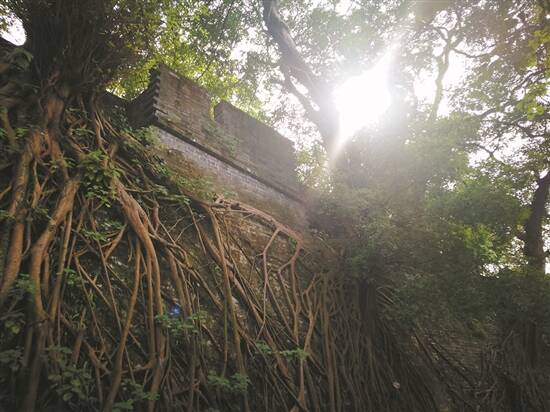 从越秀山南门登上百步梯,来到广州古城墙下。这里位于公园一隅,清幽旷远,百年榕树虬根盘结,沿城墙攀爬,向着阳光尽力生长。