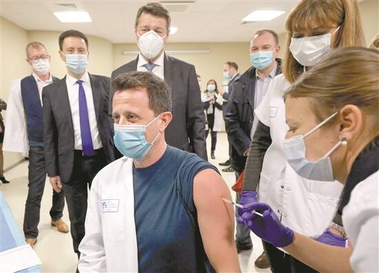5日,一名医护人员在法国尼斯一家医院接种新冠疫苗 新华社发 |