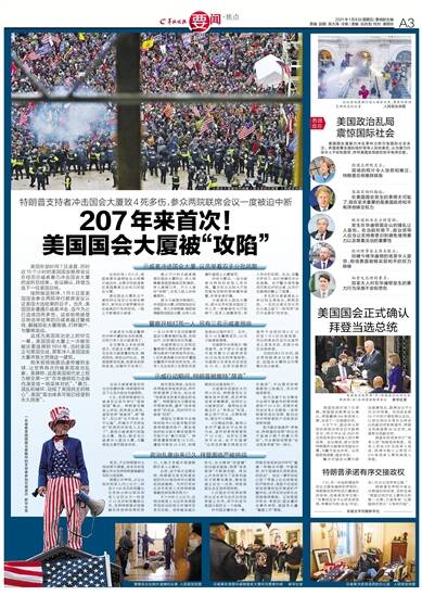 美国东部时间7日凌晨,历时近15个小时的美国国会联席会议在经历示威者暴力冲击国会大厦的波折后结束。会议确认,拜登当选下一任美国总统。 按照既定程序,1月6日是美国国会参众两院举行联席会议认证美国大选结果的日子。当天,美国国会遭遇示威者冲击,迄今为止已造成四死多伤。这些拒绝接受总统选举结果的示威者越过警戒线,翻越国会大厦围墙,打碎窗户,与警察混战。 这成为美国政治史上的罕见一幕。美国国会大厦上一次被攻破还要追溯到1814年,当时美国正与英国交战,英军冲入美国国会大厦并放火焚烧这一建筑。 相关视频画面迅速传播到全球,让世界再次目睹美国政治乱象。美媒称,这是美国现代史上权力移交第一次“在华盛顿权力走廊内演变成一场实体对抗”,“暴力、混乱和破坏,动摇了美国民主的核心”,美国“政治体系可能已经受到永久损害”。 示威者冲进国会大厦,议员举着双手分批疏散 当地时间1月6日,美国首都华盛顿发生大规模示威活动,主要目标就是象征美国最高立法权力的国会大厦。 通往国会大厦的主干道和附近地区已实施车辆禁行,新华社记者带着采访设备骑自行车到现场,一路上不断看到示威者。 数以万计的示威者围堵在国会大厦附近,有人挥舞着美国国旗或自制旗帜,有人高喊口号。不少人装扮“抢眼”,还有人脸上涂抹着颜料。 部分示威者冲破围栏,冲进国会大厦,试图阻挠会议进程。有人手持棍棒,砸碎玻璃窗爬进国会大厦,也有人沿着外墙爬上大厦楼顶。 冲进大厦后,一些示威者与持枪的安保人员对峙。警方在众议院大厅发现数枚自制的简易爆炸装置,所幸未被引爆。 示威者冲入国会大厦后,部分议员和其他国会工作人员一度蜷缩在大厅座椅下,很多人面露惊恐,有人用手机拍照。此后,在警方护送下,他们举着双手分批疏散。由于警方使用催泪瓦斯应对抗议者,议员们在撤离时戴上了面罩。 多名抗议者直接坐上参议院主席座位,频频自拍。一名抗议者还在议员办公桌上留下一张写有“我们不会罢休”的字条。 警察开枪打死一人,另有三名示威者殒命 示威者在与国会警察的对峙中遭到枪击和逮捕,目前已有4名示威者身亡。 社交媒体上多段视频显示,在国会大厦内部,一名女性示威者遭到枪击,瞬间倒地,被抬出时吐血。据美国媒体报道,她被送到医院急救,但最终不治身亡。一名24岁男子在试图攀爬国会大厦高墙时坠落,送院治疗,目前情况依旧危重。 华盛顿哥伦比亚特区警察局代理局长罗伯特·康蒂当晚举行新闻发布会说,1名死者是暴力冲击中遭国会警察开枪射击的女性,另有1名女性和2名男性在紧急救治过程中死亡。此外,至少14名警察受伤,52名示威者被逮捕。 华盛顿市长缪里尔·鲍泽宣布,由于部分示威者可能将暴力示威持续至20日当选总统拜登就职,华盛顿公共紧急状态将延长15天。此前华盛顿已宣布于当地时间6日18时至7日6时实施宵禁。邻近的弗吉尼亚州也宣布进入紧急状态,在部分地区实施宵禁。 当地时间6日20时,国会两院联席会议得以复会,但国会大厦附近仍聚集大批示威者。 示威行动期间,特朗普被推特“禁言” 这些示威者都是在现任总统唐纳德·特朗普的号召下从各州赶往华盛顿的。 6日,支持特朗普的示威者在白宫外举行“拯救美国”集会。特朗普在集会上讲话,拒绝承认败选,宣称选举“被偷窃”,被“操纵”,自己将“永不放弃、永不认输”,并痛斥不支持他的“软弱的共和党人太多了”,敦促示威者游行到国会大厦。随后,数百名示威者冲入国会大厦,与警察发生激烈肢体冲突。 面对混乱局面,当选总统拜登发表电视讲话,呼吁特朗普捍卫宪法,站出来“结束其支持者对国会的包围”。特朗普在社交媒体发布简短视频,重申“选举被偷窃”的说法,同时呼吁示威者“回家”。 美国社交媒体平台推特和脸书6日宣布暂时封禁特朗普的账户,理由是他的帖文缺乏事实根据并可能产生“暴力风险”。特朗普遭推特禁言12小时,遭脸书禁言24小时,封禁期间无法登录账户。 示威者冲进国会大约两小时后,特朗普在社交媒体发布视频,再次声称选举涉嫌舞弊,但同时让示威者回家。推特给这条推文打上“有争议”标签,禁止用户评论、点赞和转发,随后予以屏蔽。 6日晚些时候,推特以多次严重违反平台规定为由,宣布封禁特朗普账户12小时。这家社交媒体平台说,由于华盛顿“出现空前暴力局面且仍在继续”,平台要求特朗普删除三条推文,否则将继续禁言。 脸书及旗下社交媒体平台照片墙宣布封禁特朗普账户24小时,视频共享网站优兔6日删除一条特朗普的类似视频,暂时没有对特朗普账户采取其他限制举措。 脸书副总裁盖伊·罗森说,特朗普的视频“助长而不是减少眼下的暴力风险”,平台删除视频是“恰当紧急举措”的一部分。 政治乱象由来已久,拜登面临严峻挑战 其实,不止特朗普对大选结果不满意,很多共和党籍议员也支持特朗普推翻现在的大选结果。 根据公开声明,占众议院共和党人约三分之二的至少140名共和党籍众议员和占参议院共和党人近四分之一的至少12名共和党籍参议员,支持特朗普试图推翻总统选举结果的努力,人数之多超乎美国朝野许多人士意料。 此前,由于缺乏证据支持,特朗普及其支持者发起的约60起选举诉讼都被驳回或撤销。为何仍有如此多共和党人支持特朗普推翻选举结果的努