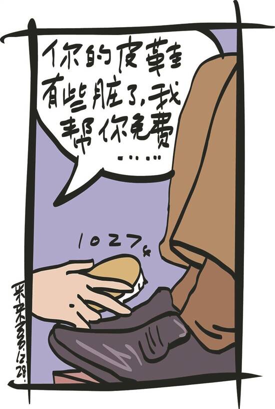 插图 采采 “大哥,一支只卖20元,皮衣皮包皮鞋等都可以反复擦拭的无色液体防护油……你的皮鞋有些脏了,我帮你免费擦擦吧?” 坐在钢木椅上等公交车的贺小韦,扫了一眼被阳光晒得微微发黑的姑娘,正在他犹豫的时候,姑娘已蹲下身非常熟练地为他擦起了皮鞋…… 贺小韦极力回想着,虽然手机可能落在公交站台的椅子上,但却不能确定是否是那位卖鞋油的姑娘捡到了。想到此,他又有些自责,在上公交车前,鞋子还没完全擦好,结果赶时间的他不但没买鞋油,连‘谢谢’也没来得及说一声。 “不管能不能找回来,总得试试吧。”同事边说边拨打贺小韦的手机号……“你好,我……找下这个手机的主人。” “啊……我也在找他。”电话中的女声普通话标准得像广播播音员一样圆润:“您若能联系到他,请他到交通大道东兴公交站台来拿回手机,我在这附近等他,谢谢!” 同事挂上电话,打出OK的手势说:“你小子命好,遇到好人了。走,我陪你跑一趟。” 贺小韦指点着同事将车停到东兴站附近、他常去的也是方便停车的彩票站前,下车一扭头,发现卖鞋油的姑娘正在彩票店内给一老者擦皮鞋。 “嗨。”贺小韦在姑娘擦完鞋抬起头的一瞬间开了口:“刚走得急不好意思啊。”“没事啊,你来得正好。”姑娘看着贺小韦,微微一笑从包里拿出手机说:“刚还有人电话找你呢。” (杨宝江)