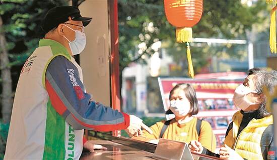 志愿者驿站里,甘永乐正在为前来询问路线的游客提供服务 |