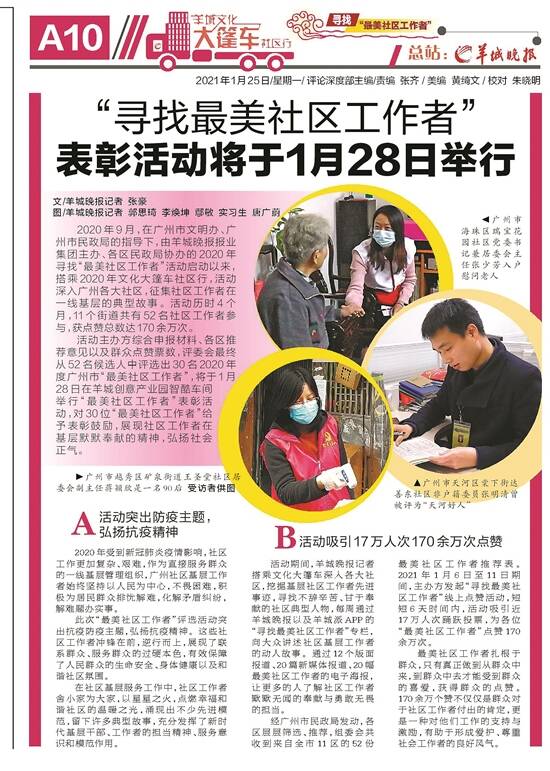 文/羊城晚报记者 郭思琦 28日,2020年广州市“最美社区工作者”表彰活动在羊城创意产业园智酷车间举行。 30位“最美社区工作者”获得表彰,鉴于疫情防控,现场邀请了其中10位获奖者作为代表参加。 据悉,寻找“最美社区工作者”活动在广州市文明办、广州市民政局的指导下,由羊城晚报报业集团主办、各区民政局协办。该活动深入广州各大社区,征集社区工作者在一线基层的典型故事。活动历时三个月,11个街道共有52名社区工作者参与,获点赞总数达170多万。 越秀区4人 越秀区北京街长胜里社区专职副书记 郭慧诗 2018年“山竹”来袭,她劝说危房居民搬至街道救助中心;2020年新冠肺炎疫情,她负伤但投身社区一线。她的足迹踏遍社区大街小巷。 越秀区矿泉街王圣堂社区居委会副主任 蒋颖欣 面对社区内的涉外聚集性疫情,她全程参加了瑶台片区高风险“洗楼”行动,3天完成156间出租屋300多人的健康排查。她用行动诠释90后干部的担当与使命。 越秀区梅花村街杨箕社区书记 刘燕仪 疫情来袭,面对近1.6万常住人口,她与社区民警、医生“三人小组”用简单的医用口罩、雨衣作为防护服,顶着潜在的危险,上门排查情况。 越秀区东山街寺右社区书记、居委会主任 吕艳虹 她总是挑起急难险重的工作并做出亮眼成绩。她在基层开创的分层议事的工作模式得到了国家民政部、省民政厅等部门的关注和肯定。 海珠区3人 海珠区凤阳街南珠社区书记 蔡惠玲 为解决地铁11号线上盖66户业主拆迁补偿难题,她逐户排查摸底、商讨解决方案,保障各方权益;疫情期间社区内一酒店成为集中观察场所,她努力安抚群众,担起守护之责。 海珠区华洲街小洲社区居委会主任 简蕙 疫情期间,为了不让同事接触潜在隐患的对象,她安排自己值守车站;为做好登革热防控,她总是在炎热夏日深入蚊虫易滋生区域清理……社区工作17年来,她将居民事放心间。 海珠区瑞宝街瑞宝花园社区书记兼居委会主任 张少芳 她作为一名军嫂从不怕苦,成立了居民共治的“志愿者巡逻治理服务队”,带领队员一日两巡,地上有垃圾,墙上有广告……都逃不过巡逻队员们的“火眼金睛”。 荔湾区3人 荔湾区冲口街杏花社区书记 刘艳华 组建冲口街杏花扬帆党群志愿队、为困难群体提供各类生活帮助……她不断拓展服务模式,致力打造“家门口”服务体系。 荔湾区昌华街泮塘社区居委会主任 邝美娥 疫情防控期间,她上门核查、安慰发热人员等。她还将社区划分成6个大片区网格,建立起8个街巷防控居民微信群,把防控措施一一落实。 荔湾区西村街和苑社区书记 邓映玲 疫情暴发以来,她始终坚守一线,带领社区居委会人员奋战一线,鼓励社区居民,保住了“病毒零输入”的安全环境,为社区居民撑起一片健康安全的天空。 天河区2人 天河区棠下街达善东社区非户籍委员 张明清 “有什么问题,找明清准没错!”居民养蜂存在安全隐患、饭馆排烟管直捣居民楼……大大小小的问题通过“达善东社区幸福群”微信群反映给他,总能得到妥当解决。 天河区冼村街冼村社区书记 严小玲 在疫情前期医疗物资紧缺时,她用一只口罩完成2000余户信息排查。面对冼村改造工作进展不顺利、未签约村民不满意时,她起早贪黑耐心听取意见解决难题。 白云区3人 白云区白云湖街大朗货场社区专职工作人员 谢家艺 疫情防控期间,她不幸被撞骨折,虽身在病床,但她始终坚持工作,告知社区同事隔离人员家庭情况,保持跟进服务对象等。她用实际行动,书写了社区工作者的担当。 白云区大源街大源村党委委员、妇女主任 李银开 “有问题,找开姐!”在白云区大源村,她是出了名的热心肠。小到夫妻矛盾、挽回破碎家庭,处处可见“开姐”身影;大到疫情防范、垃圾分类推进,“开姐”始终奔波在前线。 白云区新市街汇侨北社区书记 李伟清 面对境外疫情暴发,他做好非洲籍社区居民沟通交流及健康管理服务,还通过街道平安促进会为有经济困难的非洲籍人员筹集生活费用,获得社区涉非籍居民好评。 黄埔区2人 黄埔区云埔街誉品社区书记 周璇 她主动取消休假投身抗疫一线,带领工作人员逐户排查,及时建立起湖北籍居民微信群。疫情防控中,她交出了一张“零确诊、零疑似”阶段性胜利的答卷。 黄埔区云埔街沧联社区书记 钟永强 面对新冠肺炎疫情,他临危不乱,明确防控重点难点;在发现确诊病例后,他火速赶往现场展开加固围蔽、安抚情绪、配合检查,确保及时阻断疫情扩散。 花都区2人 花都区新雅街云峰社区党支部委员 王晓莲 这位川妹子在花都区新雅街云峰社区工作了4年,面对突如其来的疫情,她保障社区疫情防控工作有序开展,社区现保持“零感染”记录。 花都区秀全街花港社区书记 李凤招 她为“南漂”的秀全大妈搭建平台,让社区充满“乡土情”,她组建“秀全大妈”志愿服务队伍,并为其成立党支部,树立“秀全大妈”品牌。 番禺区3人 番禺区洛浦街丽江社区书记 谢军 他组建社区网格工作群,与多家驻社区单位党组织结对共建,先后开展走访慰问社区残疾人、长者配餐服务等活动,并成立全省首个物业纠纷调解委员会。 番禺区南村镇雅居乐北苑社区居委会主任 李玉斌 他在疫情严重期间逐户排查,与医务人员共同上门疏导居民情绪、劝说部分人员隔离观察、掌握居民健康状况,积极为一线工作人员做好安全保障