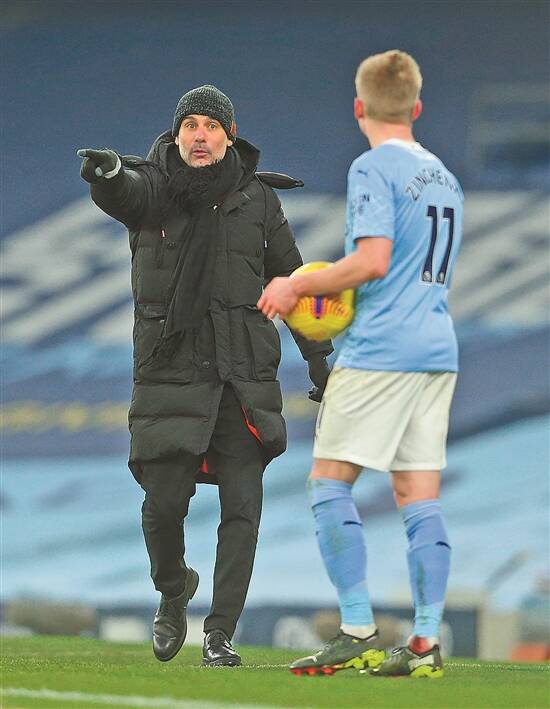 瓜迪奥拉(左)指点德布劳内 图/视觉中国 |