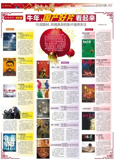 羊城晚报记者 李丽 牛年有什么优秀的影视作品值得期待?大年初一开始,羊城晚报娱乐版将推出“牛年牛作”系列内容,带大家“预习”一下2021年最值得期待的电影、剧集和综艺。在首先推出的“电影篇”中,我们将推荐一批或题材重大、或类型新颖、或风格独特的2021年新作。 牛年,国产好片看起来! 重点题材 《1921》 导演:黄建新、郑大圣 主演:黄轩、倪妮、王仁君、刘昊然、袁文康 上映:2021年 今年是中国共产党成立100周年,电影《1921》讲述的便是100年前那段热血沸腾的日子:1921年的上海,租界林立,局势剑拔弩张;一群来自五湖四海的热血青年们,突破国际各股复杂势力的监控和追踪在上海共聚,创立中国共产党,从此中国历史进入了新篇章。 曾执导《建国大业》《建党伟业》等影片的黄建新,这次集结了一众青年实力派演员。影片将重塑一群有血有肉的革命领袖,再现一个敢拼敢闯的黄金时代。 《革命者》 导演:徐展雄 主演:张颂文、李易峰、韩庚、马少骅 上映:7月1日 《革命者》讲述的是1912年至1927年间李大钊的革命事迹,以及在他引领下的仁人志士、革命先驱们传播马克思主义、创建中国共产党的热血故事。 《革命者》由管虎监制,徐展雄执导,张颂文饰演李大钊。影片将通过对李大钊生平的回顾,勾勒出一幅中国共产党创建前后的时代群像。影片开机时,管虎曾表示,希望电影能将革命先辈的坚定信仰传递给当下的年轻人。制片人梁静表示:“希望在我们的努力下,让观众看到一部不一样的红色电影。” 《长津湖》 导演:陈凯歌、徐克、林超贤 主演:吴京、易烊千玺、朱亚文、胡军、李晨 上映:2021年 1950年冬天,冰天雪地的长津湖区域,中美双方分别派遣出各自最精锐的王牌部队,一场血战即将拉开序幕……《长津湖》以长津湖战役为背景,讲述中国人民志愿军在严酷的极寒环境下,坚守阵地,奋勇杀敌,为长津湖战役胜利作出重要贡献的感人故事。 除了陈凯歌、徐克、林超贤三位大导演的首度联手,金牌编剧兰晓龙也为该片准备了五年时间,最终完成的剧本足有13万字。 《狙击手》 导演: 张艺谋、张末 主演:张译、章宇、刘浩存 上映:2021年 《狙击手》以抗美援朝战争为背景,讲述了狙击手张大弓与美军斗智斗勇并成功击败敌人的故事。值得一提的是,这是张艺谋和女儿张末首次携手,共执导筒。张末毕业于纽约大学电影学院导演系,早年便曾为张艺谋的《三枪拍案惊奇》担任剪辑师,后来又为父亲的《山楂树之恋》做过副导演。 除了《狙击手》,张艺谋今年还有两部新片值得关注——革命历史题材的《悬崖之上》,主演张译、于和伟、秦海璐、朱亚文、刘浩存;现代罪案题材的《坚如磐石》,主演雷佳音、张国立、于和伟、周冬雨。 《中国医生》 导演:刘伟强 主演:张涵予、袁泉、朱亚文、李晨、易烊千玺 上映:2021年 电影根据新冠肺炎疫情防控斗争的真实事件改编,以武汉市金银潭医院为核心故事背景,同时兼顾武汉同济医院、武汉市肺科医院、武汉协和医院、武汉大学人民医院(湖北省人民医院)、火神山医院、方舱医院等兄弟单位,以武汉医护人员、全国各省市支援湖北医疗队为人物原型,全景式记录波澜壮阔、艰苦卓绝的抗疫斗争。 冲着这剧情,就能吸引大批观众。 市场关注 《第十一回》 导演:陈建斌 主演:陈建斌、周迅、大鹏、窦靖童、春夏 上映:3月5日 作为30年前一桩杀人案的当事人,马福礼最近的生活再起波澜——市里的话剧团,要把当年的案件改编成舞台剧。除了跟话剧团导演纠缠,马福礼还要找律师帮忙寻找真相,同时调和妻子和女儿之间剑拔弩张的关系……这是自2014年的导演处女作《一个勺子》后,陈建斌时隔多年再次执导筒。影片已在2019年的北京国际电影节拿下天坛奖 “最佳编剧”,还为银幕新人窦靖童拿下了一个“最佳女配角”,值得期待。 7年前的《一个勺子》让业内外看到了陈建斌的全方位实力。如今新片照样是小切口故事演绎生活的“一地鸡毛”,周迅和窦靖童饰演陈建斌在片中的妻女,上映后必颇受关注。 《古董局中局》 导演:郭子健 主演:雷佳音、李现、辛芷蕾、葛优、王庆祥 上映:4月30日 《古董局中局》根据马伯庸同名小说改编,讲述了因一尊从日本归还的佛头而引发的古玩界风波。原著曾在2018年被改编成电视剧,由夏雨和乔振宇主演。如今在电影版里,雷佳音继《长安十二时辰》后再度出演马伯庸小说男主角,扮演虽有一身鉴宝天赋却胸无大志的“五脉”旗下白字门后人许愿。此外,李现扮演药家后人药不然,辛芷蕾扮演黄家孙女黄烟烟,葛优则扮演寻找佛头的关键人物——付贵。 《古董局中局》原著人物众多,线索错综复杂。如何用一部电影的篇幅,揭开古玩江湖的隐秘往事?对于执导过《西游·降魔篇》《悟空传》的导演郭子健来说,这又是一场考验。 《秘密访客》 导演:陈正道 主演:郭富城、段奕宏、张子枫、许玮甯、 荣梓杉 上映:5月1日 和睦的四口之家住进了一位陌生客人,之后众人在同一屋檐下生活多年。随着记忆之门再次开启,往事浮现,一件件“怪事”也随之而来,让原本和谐的家庭从此不再平静…… 作为陈正道继《记忆大师》《催眠大师》后的全新力作,《秘密访客》由郭富城、段奕宏两位奖项加身的“最佳男主角”挑大梁,保证了这部悬疑电影的演技水准。此外,张子枫、荣梓杉、