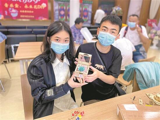 一对情侣在广州博物馆展示亲手制作的音乐盒 |