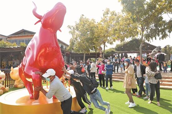 羊城晚报讯 记者张闻、通讯员张良玉摄影报道:2021年是生肖牛年,广东许多景区做足“牛”文化吸引游客,期盼牛年能够“牛”转乾坤,牛气冲天,迎来一年的好运。 佛山盈香生态园精心打造了500亩花海、一个玻璃花香屋、九大艺术花景观,构建了海陆空花景。最让游客喜欢的是放在门口的“牛”转乾坤项目,一头大红牛昂首立在转盘上,前蹄直立,不待扬鞭自奋蹄。转盘上焊着“牛转乾坤”四个字。游客可以抱牛角或牛腿,转动大红牛。这个寄托着美好寓意,参与性强的项目引来众多游客参与,不少游客一家大小一起上阵“牛”转乾坤。