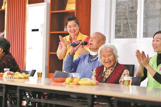 华姐(后排左一)在幸福院陪老人唱歌聊天 |