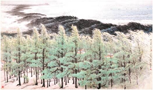 关山月先生于上世纪70年代创作的《绿色长城》是广东美术馆库房里出入最频繁的作品之一,成为各种重磅展览的“压舱石”。 关山月先生的家乡在粤西海滨。海边通常是风沙带,作物难以生长。新中国成立后,党和政府提倡植树造林,海疆也种起了木麻黄林。1973年,关山月先生到粤西电白县虎头山脚下的民兵哨所住下,和民兵一起生活,并多次写生记录,为创作积累了珍贵的一手素材。 近处的树迎风而立,与远树一同构成一道道绿色屏障,该作品表现出具有南方海岸风情和时代色彩的“绿色长城”。 关山月先生立足传统,强调写生,力求把握时代精神,在作品中融入自己对社会生活的鲜活感受,从而拓展了传统笔墨的内涵。 (文图提供 广东美术馆)