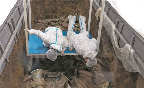 这是在三星堆遗址考古发掘现场3号“祭祀坑”拍摄的青铜面具(3月16日摄) 新华社发 |