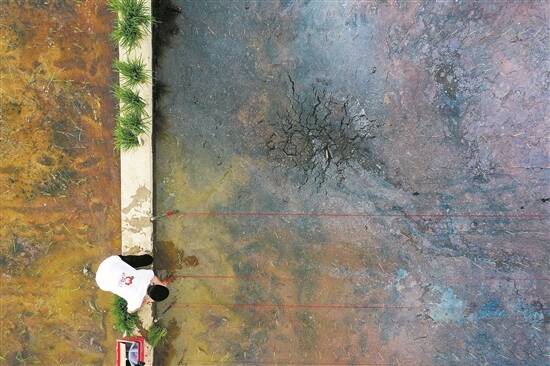 29日在增城华南农业大学试验田,研究人员把8组双行红绳拉到田间,准备插种嫦娥五号搭载的太空稻秧苗 新华社发 |