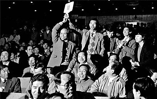 时任深圳经济特区房地产公司总经理骆锦星(举牌,左)竞拍成功 |