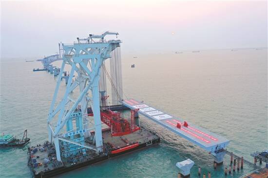 羊城晚报讯 记者王丹阳,通讯员粤交集宣、岳路建、卢志华摄影报道:4月3日早上,广东交通集团发布消息称,深中通道首片钢箱梁已于前日顺利完成架设,标志着深中通道海域桥梁全面转入上部结构施工新阶段。 2日17时58分,国内首创运架一体船“天一号”将深中通道首片长133.1米、宽20米、高4米、重达1780吨的钢箱梁,平稳运至指定桥位。随着指挥一声令下,现场作业人员精细协作,将首片钢箱梁稳稳地架设到伶仃东泄洪区非通航孔桥右幅5号至6号桥墩之间(见上图)。 如何把重量相当于近1000台小轿车的“巨无霸”钢箱梁从预制厂“发货”至架设桥位?据悉,经过多次讨论研究,工程师们决定将钢箱梁横放于集控组合模块车上,采用横向滚装方式装载上运输船。“这也是国内梁体结构体量最大的一次滚装上船。”武船重工深中通道G03合同段技术部长黄利航解释。运输船将钢箱梁运抵智慧梁场出海平台后,再由运架一体船“天一号”取梁并运往指定桥位。 目前,深中通道桥梁工程已完成主桥桩基、承台施工,正在进行主塔、锚碇施工。
