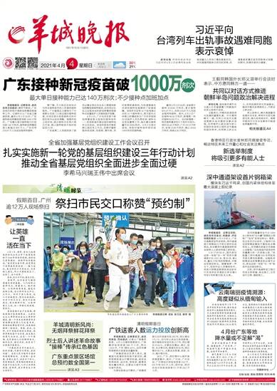 羊城清明新风尚: 无烟拜祭鲜花拜祭 详见A3 烈士后人讲述革命故事 “接棒”传承红色基因 详见A3 广东重点景区场馆 总预约数全国第一