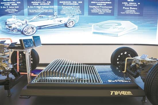 比亚迪汽车展厅的刀片电池 羊城晚报记者 宋金峪 摄 |
