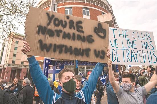 球迷举起标语,上面写着“没有球迷,你们什么都不是”、“我们爱的俱乐部背叛了我们” 图/视觉中国 |