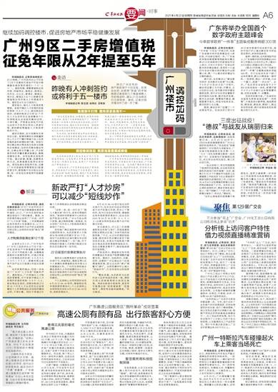 羊城晚报讯 记者李焕坤报道:21日傍晚,广州市政府办公厅印发了《关于完善我市房地产市场平稳健康发展政策的通知》(下称“通知”)。通知明确,调整增值税征免年限,将越秀区、海珠区、荔湾区、天河区、白云