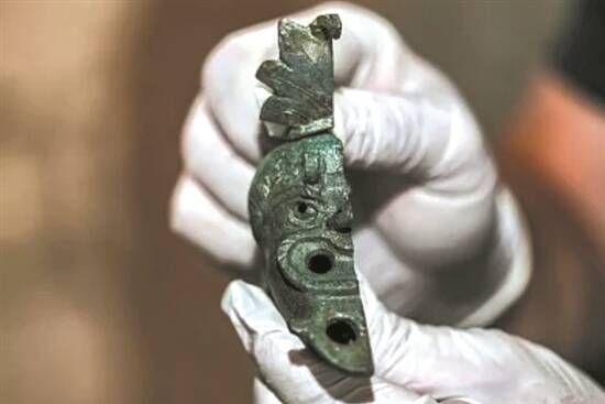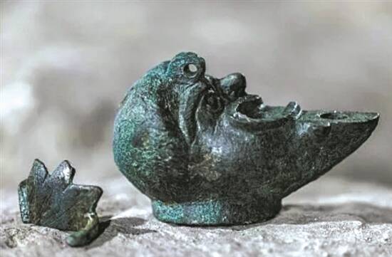 以色列考古队在耶路撒冷古城外的朝圣路下发现一盏可追溯到罗马时期的铜油灯。据说约公元1世纪时,建造古城的人将这盏铜油灯埋在建筑物地基中,以祈祷它能给建筑物及其所有者带来“好运”和“财富”。 这盏灯外观形似一个留胡子男人的脸,灯尖形似弯月,手柄形似刺叶植物,整体十分小巧。取出它时,手柄部分已与灯身脱离。有趣的是,它的造型并不是完全对称的,更像是可以挂在墙上的那种一半是平整的造型。 (文/CC 图/视觉中国)
