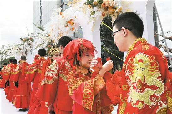 羊城晚报讯 记者符畅,通讯员云宣、廖培金报道:“520”因谐音“我爱你”而成为独具中国特色的“全民表白日”。今天上午,记者走访了广州市白云区民政局婚姻登记处,发现不少新人选择在这一天“拉埋天窗”。据广州市民政局统计,截至当天上午10时,全市共办理婚姻登记338对。 上午9时许,白云区民政局婚姻登记处已经有不少前来领证的新人,登记完成后,他们步入颁证大厅,向对方许下一生的誓言。“我们自愿结为夫妻,今天开始,我们将共同肩负起婚姻赋予我们的责任和义务……” 宣读完结婚誓词,黄小姐和温先生相拥一吻。“念完誓词,感觉肩上多了一份责任,今后要好好爱她。”温先生说。“我也愿意和你白头到老,一生只爱一人。”黄小姐说,他们相恋一年多,在“520”这个特殊的日子,终于修成正果。“登记的过程很顺利,十分钟就完成了。”黄小姐说。当天她还特意戴上了白色头纱,手捧红色玫瑰,非常有仪式感。 当天上午,白云区还举行了婚姻家庭活动启动仪式暨结婚登记集体颁证仪式,20对新婚夫妻身着礼服,现场掀头纱、交换婚戒、拥吻,并宣读爱的誓言。 据白云区民政局婚姻登记处主任刘青云介绍,5月20日当天,该登记处收到约250对登记预约,今天的办理量是平时的三倍多。