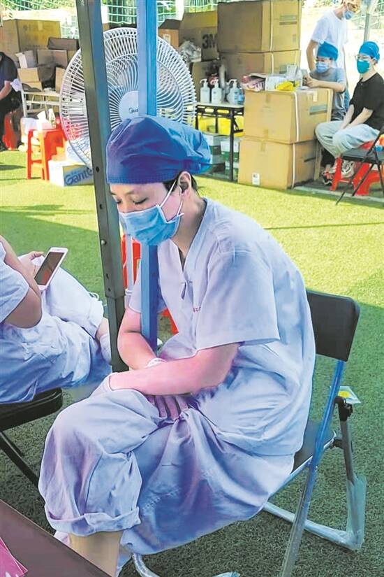 羊城晚报记者 余燕红 通讯员 王健 5月26日-27日,广州荔湾通知对全区户籍人口、暂住人口开展全员核酸检测。为此,广州多家医院的医护人员收到支援荔湾区通知后,星夜奋战,不言苦累。 医护人员到达临时采样点后,立即投入到核酸采样工作,在35℃高温下,他们穿着密不透风的防护服,坚守岗位为市民开展核酸采样。为了减少上厕所的次数,医护人员减少饮水量,渴了就咽几口口水。 广州医科大学附属中医院门诊护士梁绮鸾5天里参加了三次院外核酸采集,两次院内核酸采集。作为一名资深护士,梁绮鸾在体力上难以和年轻人匹敌。26日中午时分,来做核酸检测的人员较少,梁绮鸾靠着遮阳伞休息一下,没想到却睡着了,这一幕被同事拍下,成为网友们口中的“最美午睡照”。 而同院护士朱康宁的走红有点“误会”的成分。她是抖音上“孕妇一线核酸采集”的主人公,评论区很多网友说医院“不人性”。朱康宁解释说:“天气太热了,所以我把衣服提起来,让风能够灌进衣服透透气,没想到被路人当成孕妇拍了视频发到抖音上去了。” “穿上防护服之后,真的很热,汗湿了一身又一身!但同事们都不愿意换衣服,怕浪费物资更怕浪费时间!跟疫情赛跑的事就是大事,一刻都不容缓,同事们都觉得能为疫情防控贡献自己的一份力量而倍感荣幸,这点苦不算啥!”广州医科大学附属第二医院护士凌冬兰说。