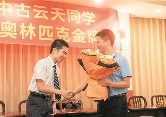 姚训琪鼓励并祝贺以中国代表队第一的成绩拿下化学奥赛金牌的古云天 |