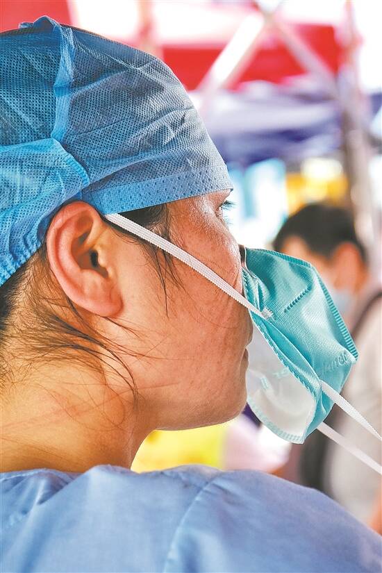 天气炎热,医护脸上压痕愈发明显 羊城晚报记者 陈秋明 摄 |