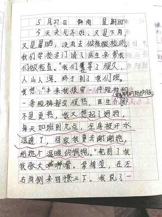 “我穿一件短袖和一条短裤都会很热,医生们穿着厚厚的防护服,那不是更热?” “他满头大汗,两只眼睛上有着浓重的黑眼圈。我对他说‘谢谢你叔叔’,他脸上露出了笑容。” “直到我回家做完作业后我还在想,我以后也要做一名救死扶伤的医生。” …… 这些稚气的语言来自荔湾区西关培正小学四年级学生的作文(见上图,受访者供)。28日晚,这些稚嫩朴实的文字被该校老师分享到朋友圈上,引发了许多人的点赞与共鸣。 记者独家获悉,荔湾区启动全区全员核酸检测后,27日,10名医护人员来到西关培正小学为孩子们进行核酸检测。在这样的经历后,王老师建议孩子们可以根据自己的感受写一篇文章。如此,便出现我们看到的作文。 有对核酸检测好奇又忐忑的—— “做核酸检测疼不疼?怎么做核酸检测?在度秒如年的时间中,核酸检测的这一刻,终于到来了……轮到我了,只见医生拿着一根棉签,让我喊‘啊’,我张大嘴‘啊’,医生拿棉签在我嘴里溜了个弯儿,便让我走了。怎么回事?这就完了?……哎,我之前还不停地自我安慰,现在看来我真是己(杞)人忧天!” 有对医护人员担忧且感激的—— “今天天气不好,又是下雨,又是暴晒……学校专门请了医生来帮我们做检查。终于到了我们班,我想本来我穿一件短袖和一条短裤都会很热,医生们穿着厚厚的防护服,那是不是更热?我又想起了妈妈每天加班到9点全身被汗水湿透了,回家我要去谢谢她,给她一个温暖的拥抱。” “我亲眼目睹了医护人员们,穿着里外三层又大又重的防护衣,汗水打湿了他们的后背,可他们依然坚守着岗位,总想着坚持。” 还有立下志向的—— “在我离开之前我对医护人员说了‘谢谢’,爸爸妈妈还夸我有礼貌。直到我回家做完作业后我还在想,我以后也要做一名救死扶伤的医生,报效祖国。” 类似的作文还有很多很多…… 王老师告诉记者:“这次荔湾区全员核酸检测,对于孩子们来说,算是一次难忘的体验。”学校里有不少孩子的父母就奋战在抗疫一线,“孩子们都和我说,经历了这次,更能体谅父母,很想给他们一个爱的拥抱!” 羊城晚报记者 李焕坤