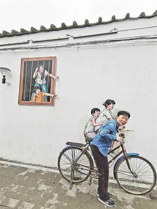 老墙被粉刷一新,变成雪白长廊。墙画里的母子以骑行单车的姿势匆匆前行,似有微风吹动他们的衣袂和发丝。他们身后一扇窗里的少男少女把手伸向窗外,似要挽住母子的身影。而画外正有一部单车倚墙而立,既让画中人的骑行动作更生动、具体,也让游人可以摆出骑行姿势参与其中,趣味盎然。