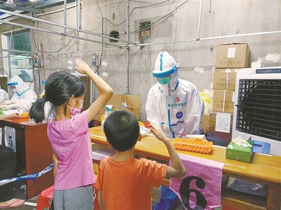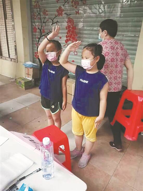 文/羊城晚报记者 张闻 图/通讯员提供 “女儿,你不是少先队员吗?快给阿姨们敬个礼!”一位妈妈话音刚落,她刚刚做完核酸检测的女儿和儿子,马上向佛山市中医院护士邱彩婷敬了一个少先队队礼。“咔嚓”一声,站在一旁的佛山市中医院呼吸科高级责任护士许志茂拍下了这张珍贵的照片。几个小时后,当许志茂再回看这张照片时,不禁泪流满面…… 故事要从5月29日下午3点说起。一场暴雨突袭禅城区城北市场检测点,大风把雨棚支架全部打翻。正在做检测的佛山市中医院医护人员和志愿者冒雨抢修检测点,迅速恢复采样。大约9点前后,轮到一个四口之家采样,两个孩子先做检测。 “姐弟俩做完核酸检测不肯走,就站在旁边看着我们。”正当许志茂和同事们感到奇怪时,姐姐忽然对着刚刚为自己做核酸检测的护士邱彩婷说了一句:“阿姨,我觉得你们太辛苦了,谢谢你们!”这时,站在一米线外的孩子母亲向女儿说道:“姐姐,你不是少先队员吗?快敬个礼。”当时,姐姐立刻带着还在上幼儿园的弟弟,向邱彩婷敬了一个标准的少先队礼。许志茂连忙拿起手机,把这一幕拍下来。 30日凌晨2点多,下班回家的许志茂在床上刷视频,却意外看到自己的家人出现在新闻里。原来,29日下午,她的哥哥已经带着她的女儿们在楼下小区做了核酸检测。两个女儿做完核酸检测后,也给身穿防护服的护士敬了礼,这一幕正好被电视台的记者拍了下来。许志茂哭了:“看到那张照片我才发觉,女儿已经懂事了。世间的美好,总是环环相扣。”
