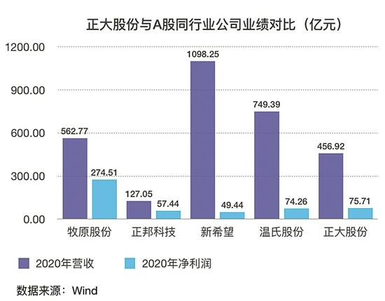 文/表 羊城晚报记者 丁玲 泰国首富家族企业要来A股上市!近日,正大股份预披露招股书,计划在沪市主板挂牌上市。招股书显示,正大股份是国内规模最大的饲料生产商和生猪养殖企业之一,是中国饲料工业化、畜牧养殖现代化的开创者和引领者。此次正大股份拟募资150亿元,拟在全国范围内建设17个生猪产业链相关项目及补充流动资金,涉及饲料加工、生猪养殖及屠宰环节。 主要股东为谢氏四家族 招股书显示,股权方面,正大畜牧投资直接持有正大股份27.03亿股股份,占本次发行前公司总股本的65%,为公司控股股东。而正大集团通过正大畜牧投资、卜蜂中国投资、正大秦皇岛食品间接持有发行人股份,是发行人的间接控股股东。值得一提的是,正大集团还是正大股份最近三年的最大客户和供应商。2018年到2020年,正大集团作为正大股份第一大客户,销售金额占比从9%上升至16%;同时正大集团作为第一大供应商,最近三年采购金额占比均保持在约20%。 正大集团是何来头?公开资料显示,正大集团由泰籍华人谢易初、谢少飞兄弟1921年创办于泰国曼谷,经过近百年的发展,已从经营单一业务的“正大庄种子行”,发展成以农牧食品、批发零售、电信电视三大事业为核心,同时涉足金融、地产、制药、机械加工等十多个行业和领域的多元化跨国集团公司。集团业务遍及全球100多个国家和地区,员工约35万人,2019年全球销售额约680亿美元。 耳熟能详的《正大综艺》,正是正大集团和中央电视台合作创办的,栏目于1990年开播,在中央电视台迄今为止已播放30年,是中国传媒领域长寿的综艺节目。 从持股比例来看,正大集团可谓不折不扣的家族企业。截至招股书披露日,正大集团共有87名股东,主要股东为谢正民家族、谢大民家族、谢中民家族和谢国民家族,持股比例分别为12.76%、12.63%、12.96%和12.96%,其中谢正民、谢大民、谢中民和谢国民系兄弟关系,上述四家族之间不存在一致行动关系,持股数量十分均衡。 根据彭博社公布的《2019年彭博亿万富翁指数Top500排行榜》,正大集团的谢国民、谢中民、谢正民、谢大民四兄弟,其个人净资产分别为51.9亿美元、45.1亿美元、44.7亿美元、43.9亿美元,合计高达185.6亿美元(约合人民币1257.3亿元),为泰国首富家族。而正大股份的董事长谢吉人是谢国民的长子,也是正大集团第三代领导人。若此次该公司在A股顺利IPO,该家族的财富有望进一步增值。 值得关注的是,正大集团此前与中国资本市场已有交集。尽管该集团并没有A股上市公司,但其曾于2013年入主平安集团第一大股东之位,并在2015年成为中信集团第二大股东。 净利润与温氏股份接近 正大股份为何要谋求上市?招股书显示,正大股份的主要产品包括饲料、生猪及屠宰产品。其中,饲料产品主要为畜禽饲料、反刍料和水产料,生猪产品主要为商品猪、种猪和仔猪,屠宰产品主要为白条猪肉、分割猪肉以及猪副产品。 2018年到2020年,正大股份实现营业收入281.71亿元、318.8亿元和456.92亿元,净利润分别为7025.8万元、20.11亿元和75.71亿元。 目前,A股养猪企业云集,不乏有牧原股份、温氏股份、正邦科技、新希望等巨头。从业绩规模来看,正大股份的营收规模逊色于新希望、温氏股份、牧原股份等,净利润规模则与温氏股份接近。 从业务模式来看,正大股份长期聚焦于全产业链一体化经营模式的打造,目前已在湖北襄阳、河南洛阳和江苏徐州等地建成投产多条“100万头生猪种养加销一体化”全产业链项目,形成多条集饲料加工和销售、生猪育种扩繁、商品猪育肥销售及生猪屠宰为一体的垂直一体化现代农牧产业链。 正大股份认为,相较于主要发展产业链单一环节的企业,全产业链经营模式能够更好实现产品质量的全程可追溯,确保终端产品的食品安全。截至去年年末,正大股份在全国29个省、市、自治区拥有现代化饲料工厂84座、预混合饲料工厂6座、自有种猪繁育场97个、规模化商品猪育肥场近1800个。 作为2020年十大领军饲料企业,正大股份的饲料产量从2018年的781.37万吨增长至2020年的949.86万吨。市场占有率由2018年的3.43%增长至2020年的3.76%,饲料业务市场占有率处于领先地位。 不过,正大股份饲料业务的占比正在逐年下滑。2018年到2020年,其饲料业务营收占比从68.05%下降至52.66%。与此同时,其生猪及屠宰业务占比则从2018年的21.78%增长至40.43%。 据正大股份披露,在生猪养殖方面,2018年-2020年,其生猪出栏量分别为429万头、419万头和432万头。此次A股IPO,正大股份拟募资150亿元,从募投项目来看,正大股份拟进一步提高生猪养殖及屠宰业务的产能。