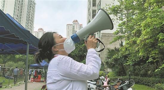 6月2日,锦绣半岛敏捷物业负责人黄璐拿着扩音器,大声提醒小区居民不要外出 羊城晚报记者 汤铭明 摄 |