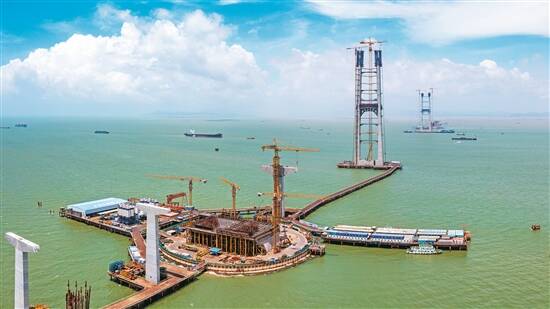 羊城晚报讯 记者王丹阳,粤交集宣、岳路建摄影报道:粤港澳大湾区建设再传好消息。6月17日中午12时,历经约12小时连续施工,深中通道伶仃洋大桥东索塔塔柱混凝土浇筑完成,标志着世界上最大跨径海中钢箱梁悬索桥首座主塔完成封顶,伶仃洋大桥正式由下部结构施工转换至上部结构施工。 “东主塔已建至262.5米,剩余7.5米的钢结构塔冠将等到主桥钢箱梁合龙后,再安装到塔顶。”深中通道工程师陈炳耀介绍,东索塔塔柱为钢筋混凝土结构,共浇筑混凝土约5万立方米,钢筋用量高达7400吨,相当于一座埃菲尔铁塔。 其中深中通道自主研发的钢筋在工厂内快速拼装成型、再整体运输至现场、利用起吊能力最大达80吨的MD3600塔吊整体起吊,有效缩短塔柱钢筋高空作业时间。能够随塔身施工进度同步爬升作业的一体化智能筑塔机,则是世界上首次在桥梁混凝土主塔建设中应用。 近日,深中通道项目被定为交通运输部首批平安百年品质工程创建示范项目。目前,深中通道伶仃洋大桥正持续推进西索塔主塔建设及东西锚碇锚体施工,中山大桥主塔已筑至180米高程,计划年内完成封顶。沉管隧道已完成共9个管节沉放对接。